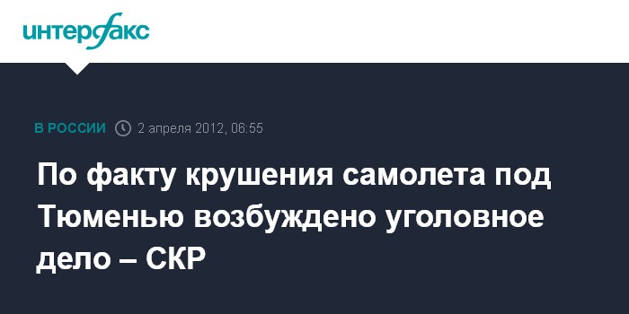 Москва. 2 апреля. ИНТЕРФАКС – Уголовное дело по статье о нарушении правил эксплуатации воздушного судна возбуждено по факту авиакатастрофы в Тюменской области, сообщил «Интерфаксу» официальный представитель СКР Владимир Маркин.