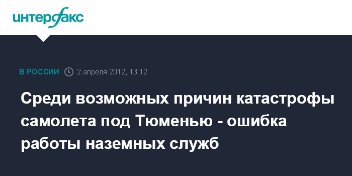 Тюмень. 2 апреля. INTERFAX.RU - Кроме версий о технической неисправности разбившегося под Тюменью самолета и об ошибке пилотирования, следственные органы рассматривают версию об ошибке работы наземных служб, сообщили агентству "Интерфакс-Урал" в пресс-службе Уральского следственного управления на транспорте СК РФ.