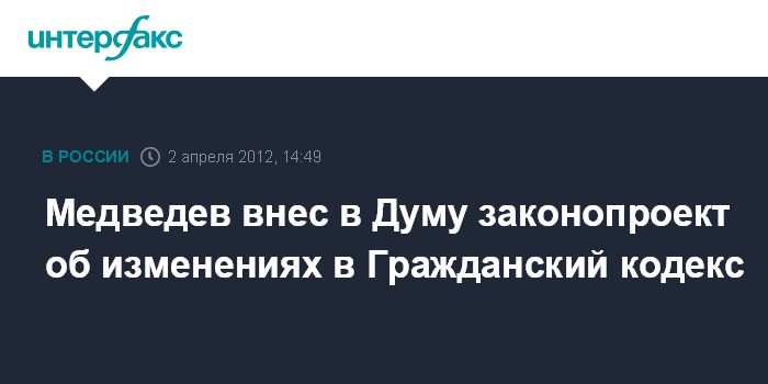 Горки . 2 апреля. INTERFAX.RU - Президент РФ Дмитрий Медведев сообщил, что внес в Госдуму законопроект о внесении изменений в Гражданский кодекс РФ.