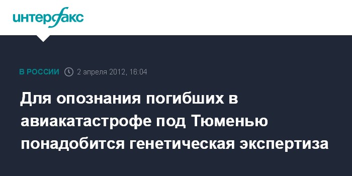 Екатеринбург. 2 апреля. INTERFAX.RU - Проведение генетической экспертизы понадобится для опознания некоторых погибших пассажиров в авиакатастрофе под Тюменью, так как их тела сильно обгорели, сообщили агентству "Интерфакс-Урал" в пресс-службе Уральского следственного управления на транспорте СК РФ.