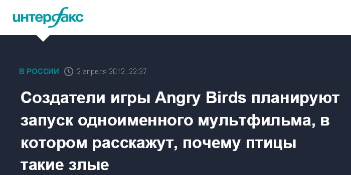 Хельсинки. 2 апреля. INTERFAX.RU - Мультипликационный сериал Angry Birds появится осенью 2012 года, сообщили в понедельник представители компании Rovio, создавшей популярную одноименную компьютерную игру. По словам главы отдела анимации этой финской компании Ника Дорры, Rovio планирует запуск 52 эпизодов мультфильма длительностью от 2,5 до трех минут, которые будут доступны в разных форматах.