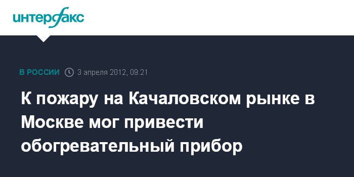 Москва. 3 апреля. INTERFAX.RU - Причиной пожара в пристройке к ангару на Качаловском рынке, где погибли 12 человек, могла стать неисправность обогревательного прибора или нарушение правил его эксплуатации, сообщил "Интерфаксу" во вторник источник в правоохранительных органах.