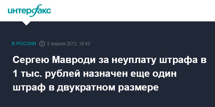 Москва. 3 апреля. INTERFAX.RU - Мировой суд оштрафовал основателя финансовой пирамиды "МММ" Сергея Мавроди на 2 тыс.рублей за неуплату штрафа.
