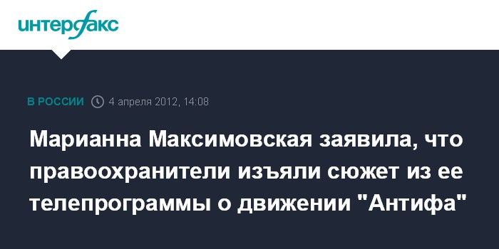 Москва. 4 апреля. INTERFAX.RU - Телеведущая РЕН ТВ Марианна Максимовская подтвердила агентству "Интерфакс", что в среду правоохранительные органы изъяли на телеканале сюжет из ее программы, вышедшей в эфир в 2009 году, где речь шла о деятельности молодежного движения "Антифа".