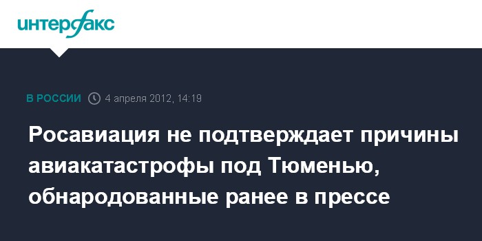 Москва. 4 апреля. INTERFAX.RU - Росавиация не подтверждает причины авиационного происшествия с самолетом ATR-72-200 под Тюменью, которые появились в ряде СМИ, говорится в сообщении ведомства.