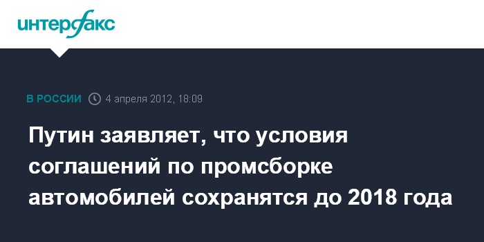 Тольятти. 4 апреля. ИНТЕРФАКС - Премьер-министр РФ Владимир Путин заявляет, что до 2018 года условия соглашений по промсборке автомобилей меняться не будут.