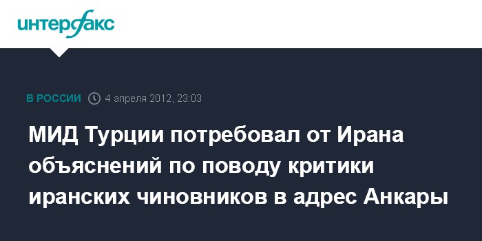 Стамбул. 4 апреля. INTERFAX.RU - Министерство иностранных дел Турции вызвало посла Ирана в Турции для объяснений по поводу критики в адрес Анкары со стороны иранских чиновников, сообщил в среду на пресс-конференции глава МИД Турции Ахмет Давутоглу.
