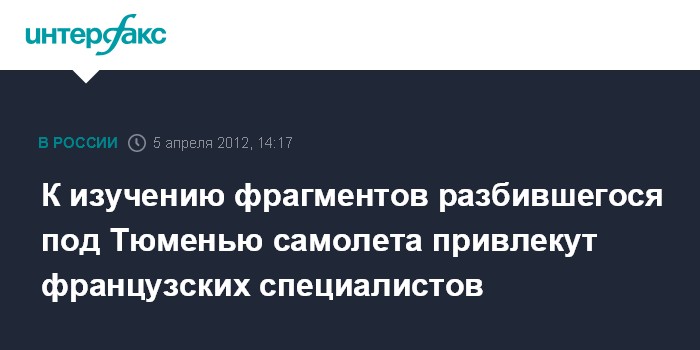 Москва. 5 апреля. INTERFAX.RU - К расследованию катастрофы самолета ATR-72, упавшего в начале недели под Тюменью, присоединятся специалисты из Франции, сообщили в Межгосударственном авиационном комитете (МАК).