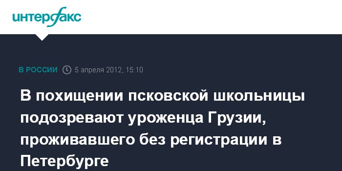 Псков. 5 апреля. INTERFAX.RU - В организации похищения псковской школьницы подозревается 25-летний уроженец Грузии, который проживал без регистрации в Петербурге, сообщает в четверг пресс-служба регионального СКР.