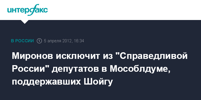 Москва.5 апреля. INTERFAX.RU - Члены "Справедливой России" и ее фракции в Мособлдуме, поддержавшие вопреки мнению руководства партии кандидатуру Сергея Шойгу на пост губернатора региона, будут исключены из партии, заявил лидер партии Сергей Миронов.