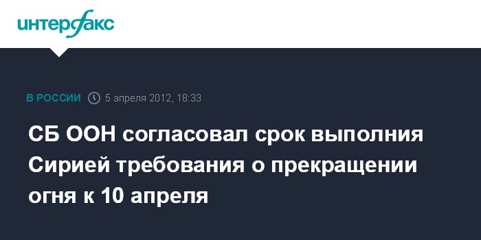 Нью-Йорк (ООН). 5 апреля. INTERFAX.RU - Совет Безопасности ООН согласовал текст заявления, которое призывает Сирию к 10 апреля прекратить боевые действия в городах страны и вывезти оттуда тяжелое вооружение и технику.