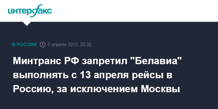 Минск. 5 апреля. INTERFAX.RU - Минтранс России направил национальной авиакомпании "Белавиа" телеграмму, которой уведомил о запрете с 13 апреля 2012 года выполнять рейсы в российские города, за исключением Москвы.