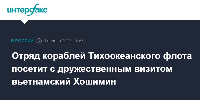 Владивосток. 6 апреля. ИНТЕРФАКС-ДАЛЬНИЙ ВОСТОК - Отряд кораблей Тихоокеанского флота (ТОФ) во главе с большим противолодочным кораблем (БПК) "Адмирал Трибуц", возвращающийся с антипиратской миссии в Аденском заливе во Владивосток, в пятницу зайдет с дружественным визитом во вьетнамский порт Хошимин.