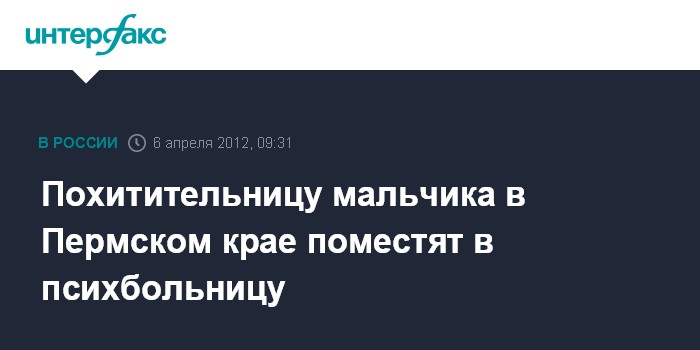 "5 апреля 2012 года вынесено постановление о помещении подозреваемой, похитившей мальчика, в психиатрический стационар. В ближайшее время 19-летняя подозреваемая будет помещена в стационар одной из психиатрических больниц Пермского края для выполнения в отношении неё комплексной психолого-психиатрической судебной экспертизы", - сообщает СУ СКР по Пермскому краю в пятницу.
