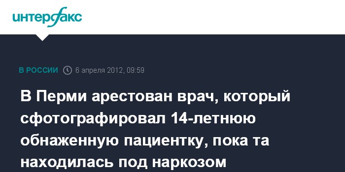 Пермь. 6 апреля. INTERFAX.RU - Врач одной из больниц Перми обвиняется в действиях сексуального характера против 14-летней девочки, которую он сфотографировал после операции в обнаженном виде.