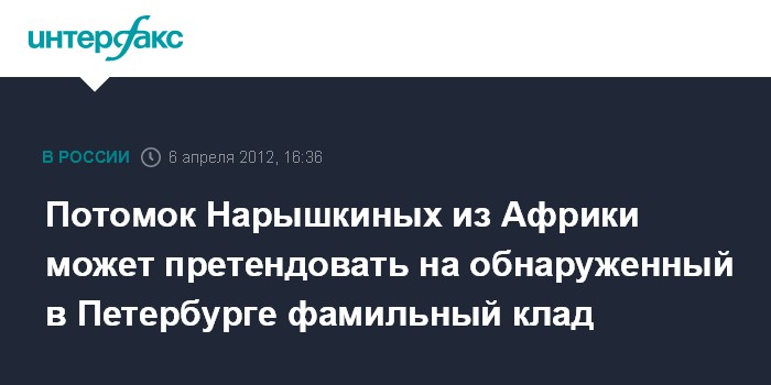 Санкт-Петербург. 6 апреля. INTERFAX.RU - Один из представителей рода Нарышкиных - 65-летний Петр Нарышкин, проживающий в Южно-Африканской республике, не исключает, что может стать претендентом на унаследование обнаруженного в Петербурге фамильного клада.