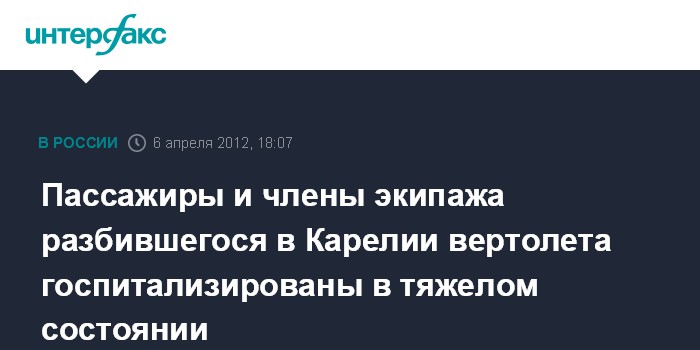 Все они живы, но находятся в тяжелом состоянии. Они госпитализированы. По словам О.Семеновой, частный вертолет летел из Санкт-Петербурга.