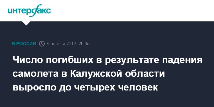 Москва. 6 апреля. INTERFAX.RU - В авиакатастрофе с самолетом СМ-2000 в Калужской области погибли четыре человека, сообщил "Интерфаксу" источник в правоохранительных органах региона.
