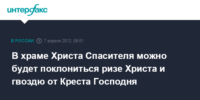 Москва. 7 апреля. INTERFAX.RU - В Вербное воскресенье, 8 апреля, по окончании литургии в храме Христа Спасителя в Москве состоится торжественное вынесение ковчега с частицей ризы Христа и гвоздем от Креста Господня на середину храма. Святыни в течение недели будут доступны в храме для молитвенного поклонения верующих, сообщает сайт Московского патриархата. Затем ковчег будет принесен в Пензенскую епархию, где верующие также смогут прикоснуться к святыне.