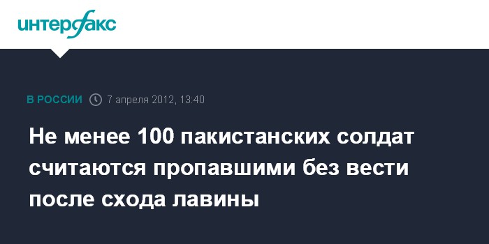 Исламабад. 7 апреля. INTERFAX.RU - По меньшей мере, 100 военнослужащих Пакистана считаются пропавшими без вести после того, как они попали под лавину в пакистанской части области Кашмир, на северо-востоке страны, сообщил местным журналистам представитель армии генерал Атар Аббас. "Около шести часов утра военную казарму накрыла лавина, под нее попали около 100 солдат", - сказал он.