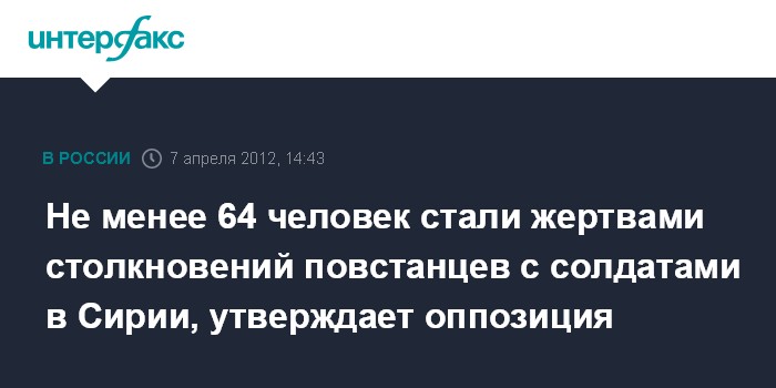 Каир. 7 апреля. INTERFAX.RU - По меньшей мере, 64 человека были убиты в субботу военными в различных регионах Сирии, сообщили сирийские оппозиционные координационные комитеты. По их утверждению, не менее 36 человек стали жертвами "резни", устроенной солдатами в населенном пункте Латманех, в центральной провинции Хама.