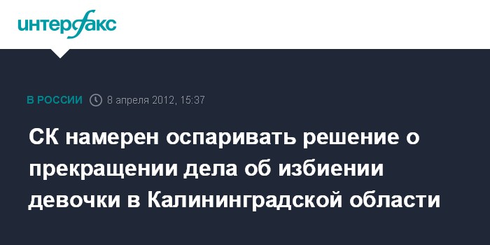 Москва. 8 апреля. INTERFAX.RU - СК РФ будет оспаривать решение о прекращении уголовного дела об избиении девочки в городе Гусев Калининградской области, вплоть до обращения к генпрокурору РФ, заявил "Интерфаксу" официальный представитель СК РФ Владимир Маркин.