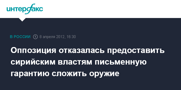 Бейрут. 8 апреля. INTERFAX.RU - Оппозиция не выполнит требования сирийских властей предоставить сирийским властям письменные гарантии того, что повстанцы сложат оружие, перед тем как власти выведут войска и тяжелую технику из городов, заявил в воскресенье главнокомандующий Свободной сирийской армией генерал Рияд аль-Асаад. Ранее сообщалось, что сирийский МИД в воскресенье официально потребовал от оппозиции подобных гарантий. Стороны сирийского конфликта, не доверяя друг другу, ждут для начала решительных действий по прекращению огня от противника.
