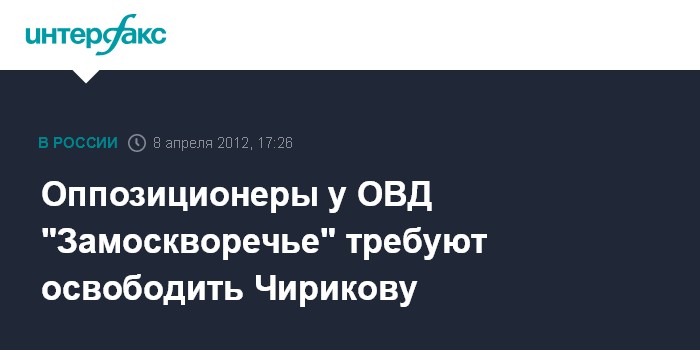 Оппозиционеры пришли к ОВД "Замоскворечье", чтобы потребовать освобождения лидера движения "В защиту Химкинского леса" Евгении Чириковой, которая была задержана ранее на Красной площади, передает корреспондент "Интерфакса". Оппозиционеры скандируют: "Свободу!" и "Руки прочь от мирных граждан!".