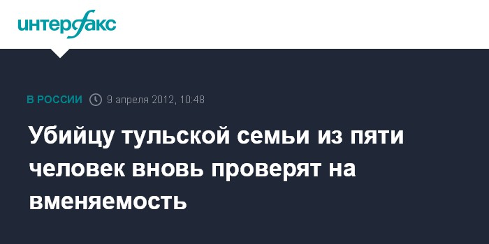 Тула. 9 апреля. INTERFAX.RU - Житель Тулы Иван Иванченко, обвиняемый в убийстве пяти членов семьи - двух женщин и троих маленьких детей, пройдет повторную психолого-психиатрическую экспертизу.