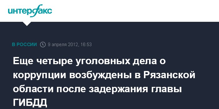 Москва. 9 апреля. INTERFAX.RU - Возбуждены новые четыре уголовных дела о взяточничестве в управлении ГИБДД по Рязанской области, после задержания начальника управления Александра Алфосова, сообщил официальный представитель СК РФ Владимир Маркин.