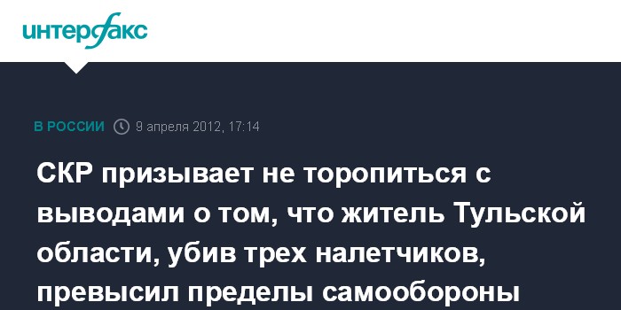 Москва. 9 апреля. INTERFAX.RU - Следствие не утверждает, что житель Тульской области, убивший в своем доме трех налетчиков, превысил пределы необходимой самообороны, заявил официальный представитель Следственного комитета РФ Владимир Маркин.