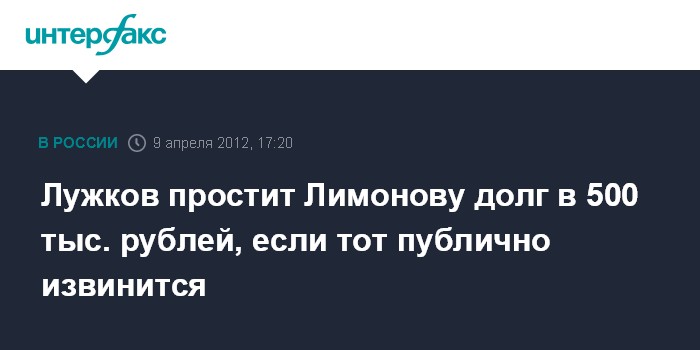 "Я готов простить Лимонову долг в 500 тыс. рублей, назначенный к взысканию Бабушкинским судом по иску о защите чести и достоинства, при условии, что он принесет мне публичные извинения", - заявил Лужков "Интерфаксу" в понедельник.