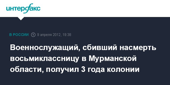 Мурманск. 9 апреля. INTERFAX.RU - Суд приговорил военнослужащий Северного флота, который насмерть сбил переходившую дорогу восьмиклассницу, к 3 годам лишения свободы в колонии-поселении, сообщил "Интерфаксу" представитель военного следственного управления СКР по Северному флоту Александр Куратов в понедельник. Кроме того, суд лишил его права управления транспортным средством на 2 года.