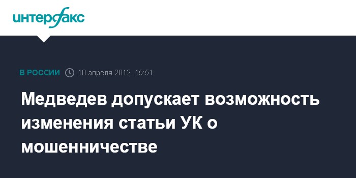 Москва. 10 апреля. INTERFAX.RU - Президент РФ Дмитрий Медведев считает возможным изменить статью 159 Уголовного кодекса России, предусматривающую ответственность за мошенничество.