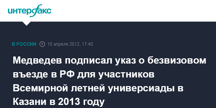 Москва. 10 апреля. INTERFAX.RU - Дмитрий Медведев подписал указ о порядке въезда в Россию и выезда из России в связи с проведением XXVII Всемирной летней универсиады 2013 года в Казани, в котором определен безвизовый режим для иностранных участников, сообщается на сайте Ростуризма во вторник. Как сообщает ведомство, указ №354 был подписан 30 марта 2012 года.