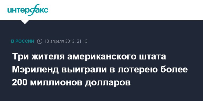 Три жителя американского штата Мэриленд выиграли в лотерею более 200 миллионов долларов
