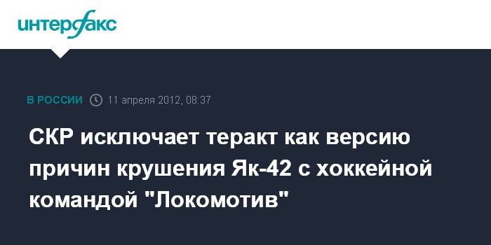 Москва. 11 апреля. INTERFAX.RU - Следственный комитет РФ категорически опровергает слухи о том, что причиной авиакатастрофы самолета Як-42 с хоккейной командой "Локомотив" на борту под Ярославлем стал террористический акт.