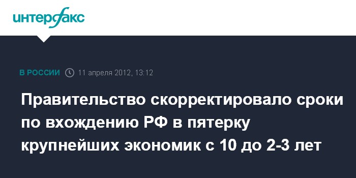Выступая перед Госдумой в апреле 2011 года, Путин заявлял, что целью правительства является вхождении в пятерку крупнейших стран в течение 10 лет - к 2020 году.