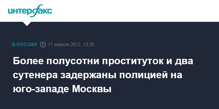 Москва. 11 апреля. INTERFAX.RU - Столичная полиция задержала более 50 жительниц Подмосковья, причастных к занятиям проституцией, и двух организаторов этого "бизнеса", сообщила "Интерфаксу" представитель УВД ЮЗАО Москвы Юлия Аносова. "Во вторник около 22 часов в районе Южное Бутово сотрудники Главного управления уголовного розыска МВД России, оперативники окружного отдела уголовного розыска при поддержке спецназа "Рысь" МВД России задержали около 60 человек, подозреваемых в занятии уличной проституцией. Среди них два организатора", - сказала Аносова.