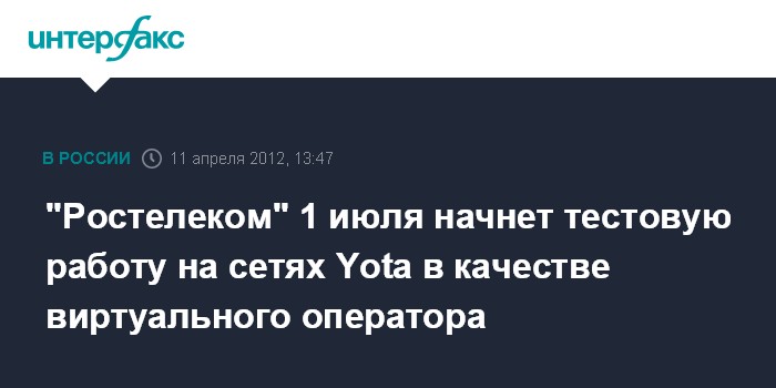 Москва. 11 апреля. INTERFAX.RU - ОАО "Ростелеком" подписало договор о создании MVNO (виртуальный мобильный оператор) на сети LTE ООО "Скартел" (предоставляет услуги под брендом Yota).