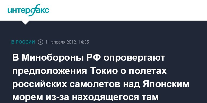 Москва. 11 апреля. INTERFAX.RU - Полеты авиации Тихоокеанского флота (ТОФ) над акваторией Японского моря не связаны с нахождением там японского эсминца "Меко", заявляет российское военное ведомство.