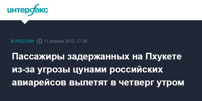 Москва. 11 апреля. INTERFAX.RU - Российские туристы, ожидающие в аэропорту Пхукета вылета в Россию, отправятся на родину в четверг утром, сообщила генеральный директор компании "Пегас туристик" Анна Подгорная порталу "Интерфакс-Туризм" в среду.