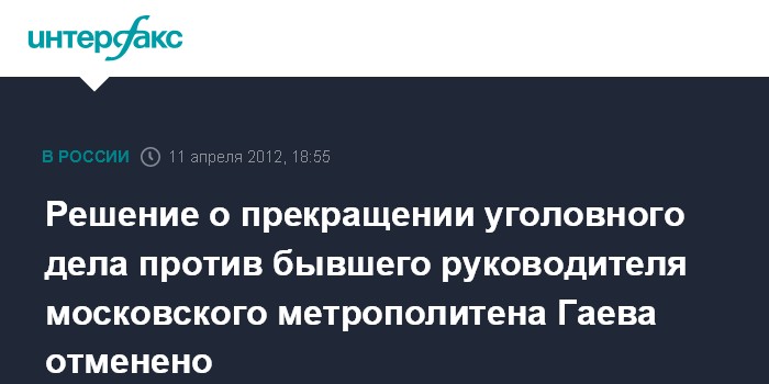 Решение о прекращении уголовного дела против бывшего руководителя московского метрополитена Гаева отменено