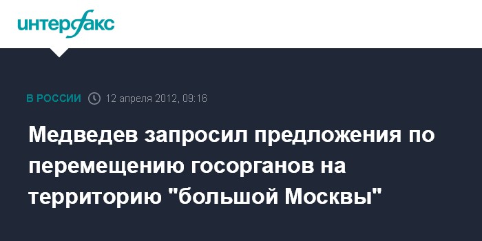 В частности, Медведев поручил к 9 июля 2012 г. представить предложения по передислокации государственных органов на территорию, присоединяемую к Москве с 1 июля. Это касается Совета Федерации и Госдумы, федеральных органов исполнительной власти, а также их территориальных органов, администрации президента, аппарата правительства РФ, Генпрокуратуры, Следственного комитета, Счетной палаты РФ, Высшего арбитражного суда, Федерального арбитражного суда Московского округа, Девятого арбитражного апелляционного суда, Верховного суда, Судебного департамента при Верховном суде, Московского городского суда.