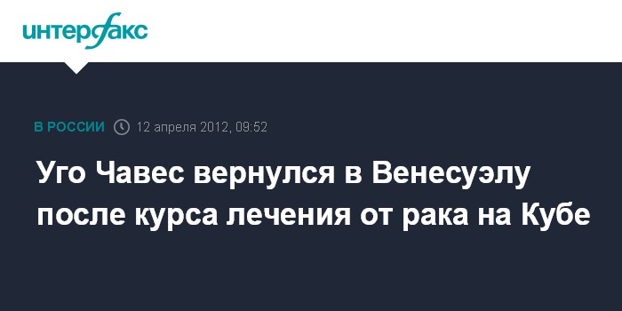 Каракас. 12 апреля. ИINTERFAX.RU - Президент Венесуэлы Уго Чавес в четверг вернулся на родину после очередного курса лечения от рака на Кубе, передает агентство EFE.