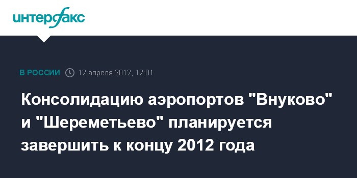 Москва. 12 апреля. INTERFAX.RU - Процесс консолидации московских аэропортов "Внуково" и "Шереметьево" планируется завершить к концу 2012 года, говорится в сообщении пресс-службы аэропорта "Внуково".