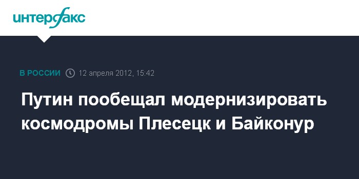 Москва. 12 апреля. INTERFAX.RU - Правительство продолжит уделять повышенное внимание модернизации космодромов Плесецк и Байконур, заявил премьер-министр РФ Владимир Путин.