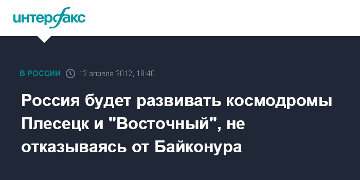 Москва. 12 апреля. INTERFAX.RU - Россия построит космодром на Дальнем Востоке для организации крупных космических проектов, таких как полеты на Луну и в дальний космос, но при этом будет развивать и другие космодромы - Плесецк и Байконур.