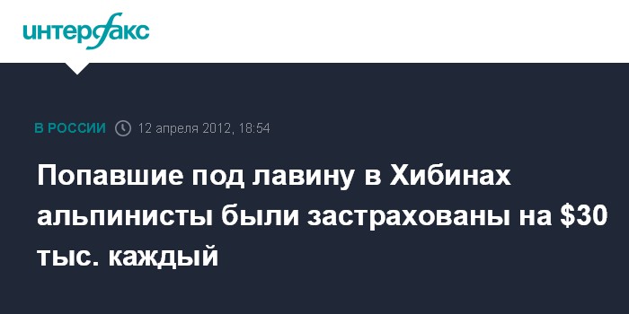 Санкт-Петербург. 12 апреля. INTERFAX.RU - Все альпинисты клуба "Политехник", попавшие под сход лавины в Хибинах, были застрахованы на $30 тыс. каждый, сообщает пресс-служба страховой компании "Альянс".