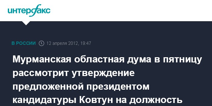 Мурманская областная дума в пятницу рассмотрит утверждение предложенной президентом кандидатуры Ковтун на должность губернатора